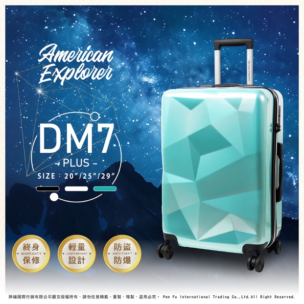 25吋 雙排靜音輪 TSA鎖 雙層防盜拉鍊 DM7 PLUS 行李箱 鑽石箱 旅...NT$ 1,485加入購物車25吋 雙排靜音輪 TSA鎖 雙層防盜拉鍊 DM7 PLUS 行李箱 鑽石箱 旅行箱 拉桿箱 輕量 American Explorer 美國探險家